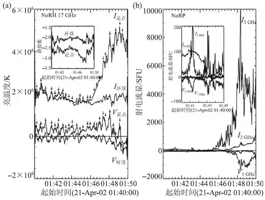 就辐射机制而言,射电微波主要来自于中等相对论电子的回旋同步辐射,而更低频率的射电辐射(分米、米以及更长波)多来自等离子体辐射及各种等离子体波和不稳定性的贡献,不在本文讨论范围内,感兴趣者可参考《等离子体动力学及其在太阳物理中的应用》[5] 一书。
