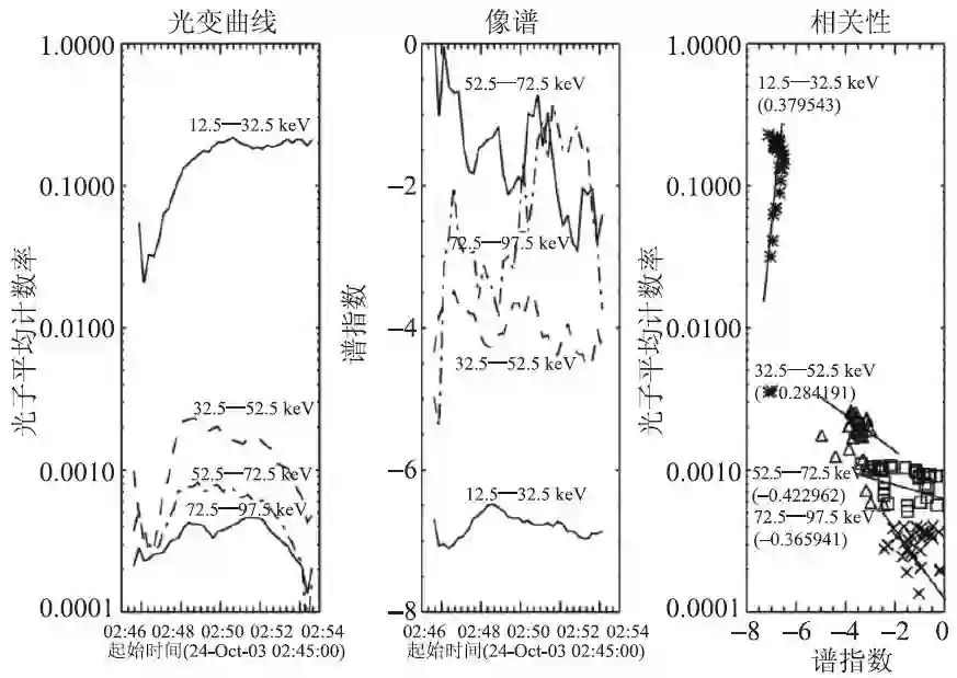 图5 2003 年10 月24 日耀斑环顶不同能段的时变、谱指数演化及其相关性[29]
