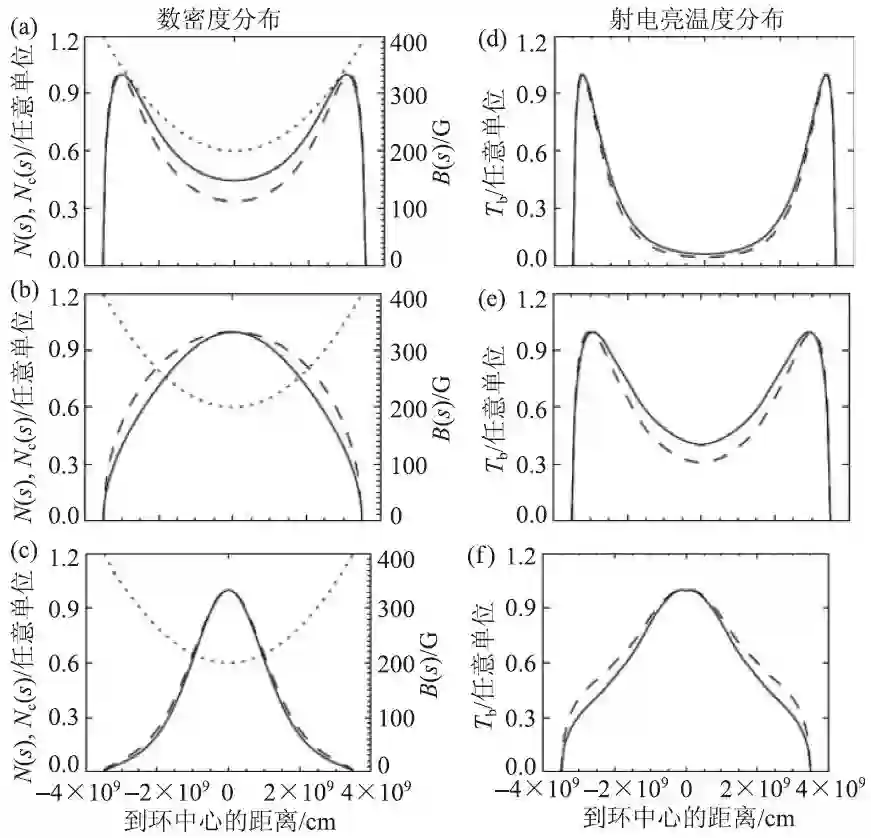 图3 左列给出电子密度的3 种沿耀斑环的分布:(a)类束流,(b)损失锥和(c)馅饼(右侧纵坐标为磁场强度)。右列为对应3 种分布的射电微波光学薄(34 GHz)亮温度分布Tb的理论计算值。实线和虚线分别表示密度N和柱密度Nc,点线表示磁场强度B[18]