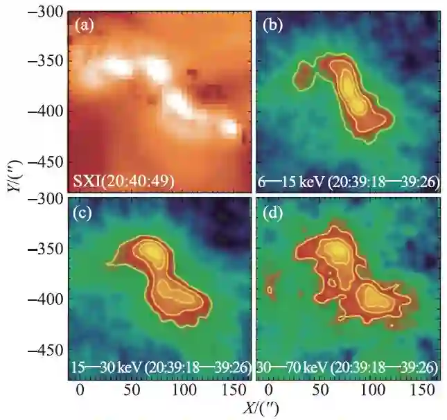 (2)非热电子的加速通常具有能量下限即所谓低能截止(等离子体物理称之为逃逸限),在观测到的硬X射线能谱中表现为低能端变平(偏离幂律分布),成为研究非热电子加速的重要参量。由于光球的康普顿散射同样会造成低能端变平,低能截止是否存在曾被质疑[35];然而,RHESSI卫星的大样本统计表明,即使扣除康普顿散射仍不能排除低能截止的存在[36]。