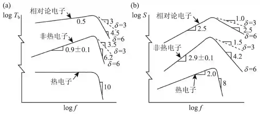 图1 对数坐标下的回旋同步辐射谱(a)亮温度谱Tb;(b)流量谱S。电子能谱指数δ为3—6,微波谱斜率(绝对值)用直角标注,横坐标为频率f [8]