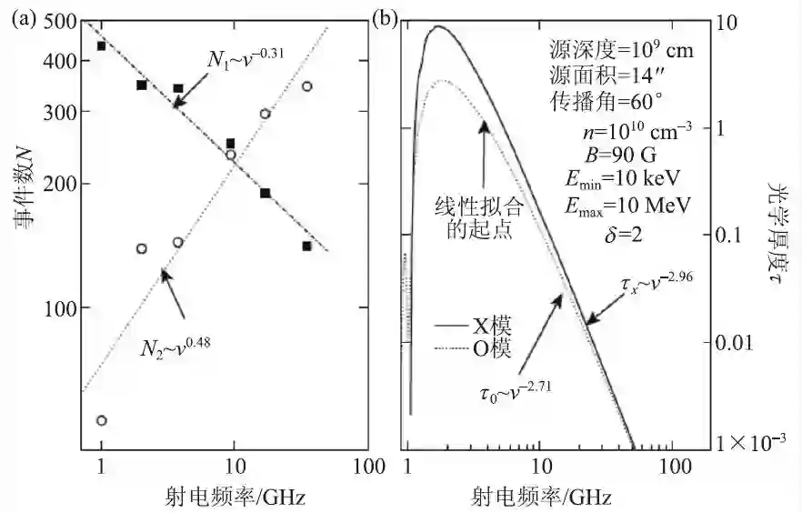 图2 (a)满足和偏离幂律分布的事件数(N2和N1)随频率变化;(b)回旋同步辐射光学厚度τ随频率变化(n为等离子体密度,B为磁场,Emax和Emin为电子能量的上下限)[16]