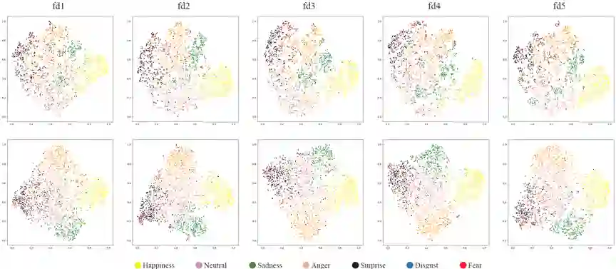 图2 网络学习到的人脸特征分布。相比基准网络(第一行), Former-DFER(第二行)能够学习到更具有判别性的人脸特征。