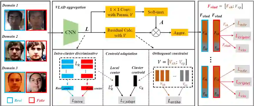 由于欺诈人脸的线索通常是细微、局部的,反映到feature map上则是占比较少。常用的GAP将欺诈线索特征和无线索特征求平均得到全局特征进行分类,导致欺诈特征的显著性被削弱。我们使用VLAD聚合方法,使用词表来量化局部特征,将欺诈特征和无线索局部特征分配到不同的视觉单词,再分别聚合,对应到VLAD特征的不同纬度,以保留局部特征的局部辨别能力。如图1所示,带有领域和真假标签的人脸被送入CNN网络中得到局部特征,在VLAD聚合模块中得到全局VLAD特征,然后被分类损失和三元组损失(Lcls, Ltriplet)优化。