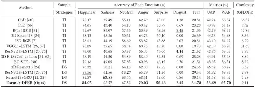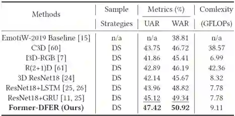 为了检验Former-DFER对于动态人脸表情识别的有效性,我们在两个视频表情识别数据集上做了实验,表1和表2分别展示了Former-DFER在DFER和AFEW上的性能表现。