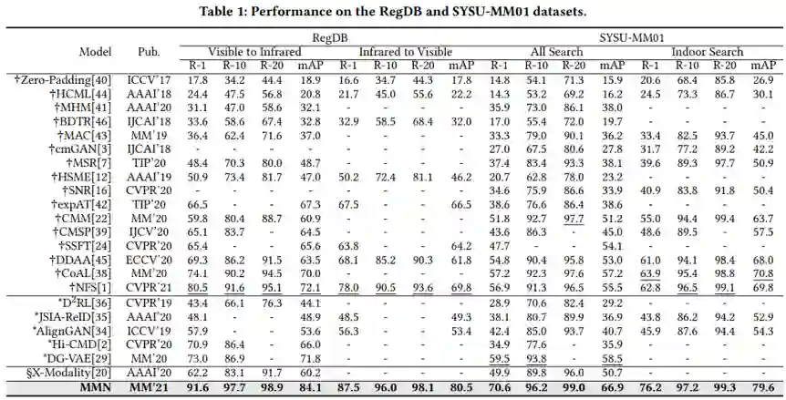 如表1所示,与现有方法相比,本文所提出的MMN在RegDB与SYSU-MM01两个数据集上,均达到了最高的结果,表明了本文所提方法的有效性。