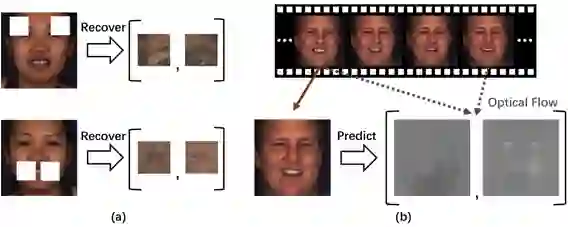 图1 两个AU相关的自监督辅助任务:(a) 关键区域补全,(b) 基于单帧的光流估计