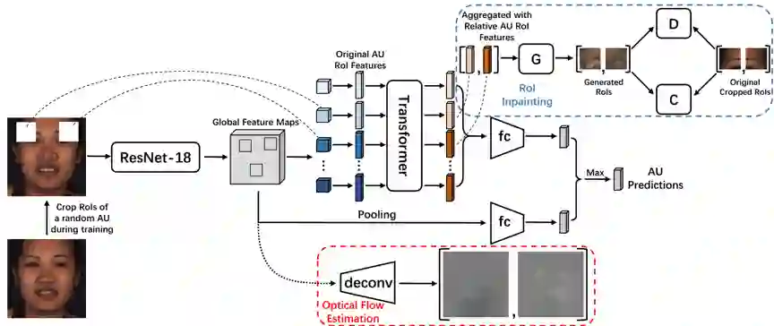 将上述两个自监督任务与AU识别任务结合在一起,形成了区域和时序辅助任务学习(Regional and Temporal Auxiliary Task Learning, RTATL)框架。RTATL的网络结构如图2所示,其中蓝色和红色虚线内分别为区域补全和光流估计两个任务的对应网络模块,中间为骨干部分。可见在训练过程中基于有标签和无标签数据,所有模块同时被训练;而在测试时虚线内的网络模块被移除,仅使用骨干网络识别AU,因而并没有增加网络在部署时的耗时。