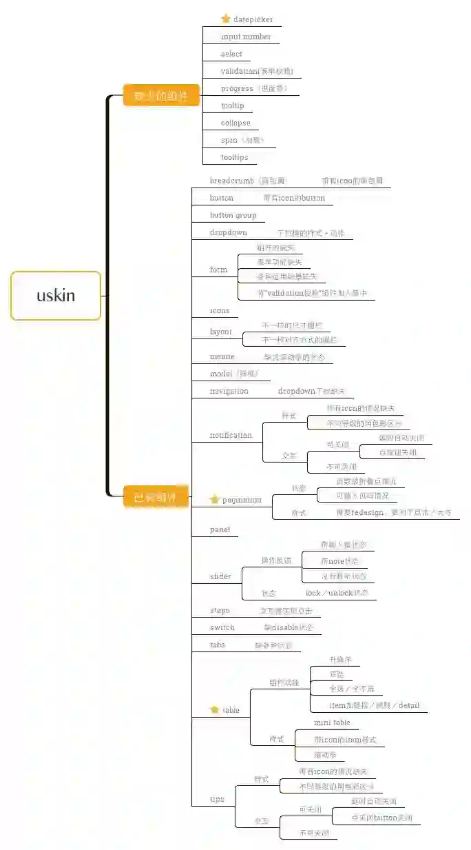 对组件进行分类,注意的是有一些组件可能会出现个性化的情况。根据产品经理需求而定。对照新版本和需求,对现在没有的组件也进行标注,以下面的方式进行展开