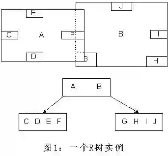 这种方式使我们不必遍历所有数据即可获得答案,效率显著提高。下图1是R树的一个简单实例:
