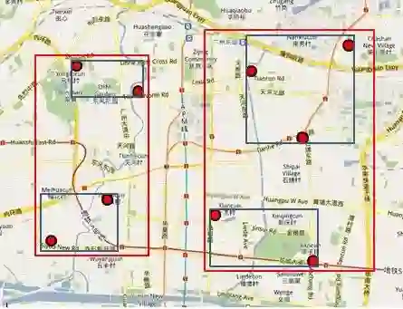 4 最后选择天河城所在的那个区域(对应叶子结点,存放有最小矩形),遍历所有在此区域内的结点,看是否满足我们的要求即可。