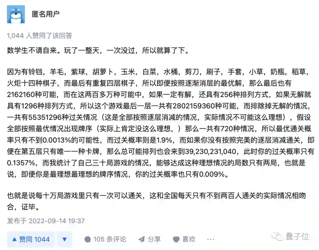 按照这位答主的结论,结合Ta自己30局游戏的情况,即使牌序理想,通关概率也不过0.009%。