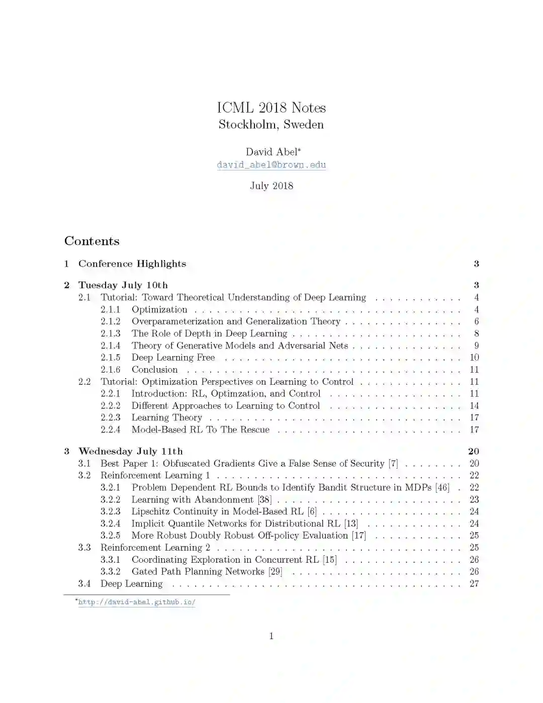 几天前,美国布朗大学的一位同学 David Abel,公开分享了他在这次大会上整理的长达50多页的会议笔记。这份笔记内容详实,包含了不少来自现场拍摄的PPT图片,还根据参会日期和会场做了详细的目录。 每听一个报告,David Abel 都尝试总结:Problem Definition, New Idea, Model,Conclusion等, 学霸的气息铺面而来。