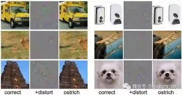 如图所示,每张图像强加一个噪音图像,视觉上不会改变原始图像,但被错误分类为鸵鸟!