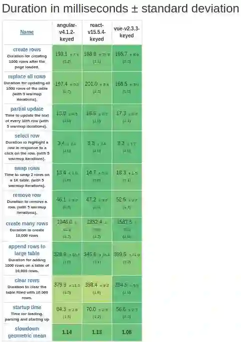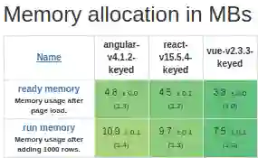 可见,这些性能测试显示,Vue 比 React 占用的内存更少,运行速度更快。