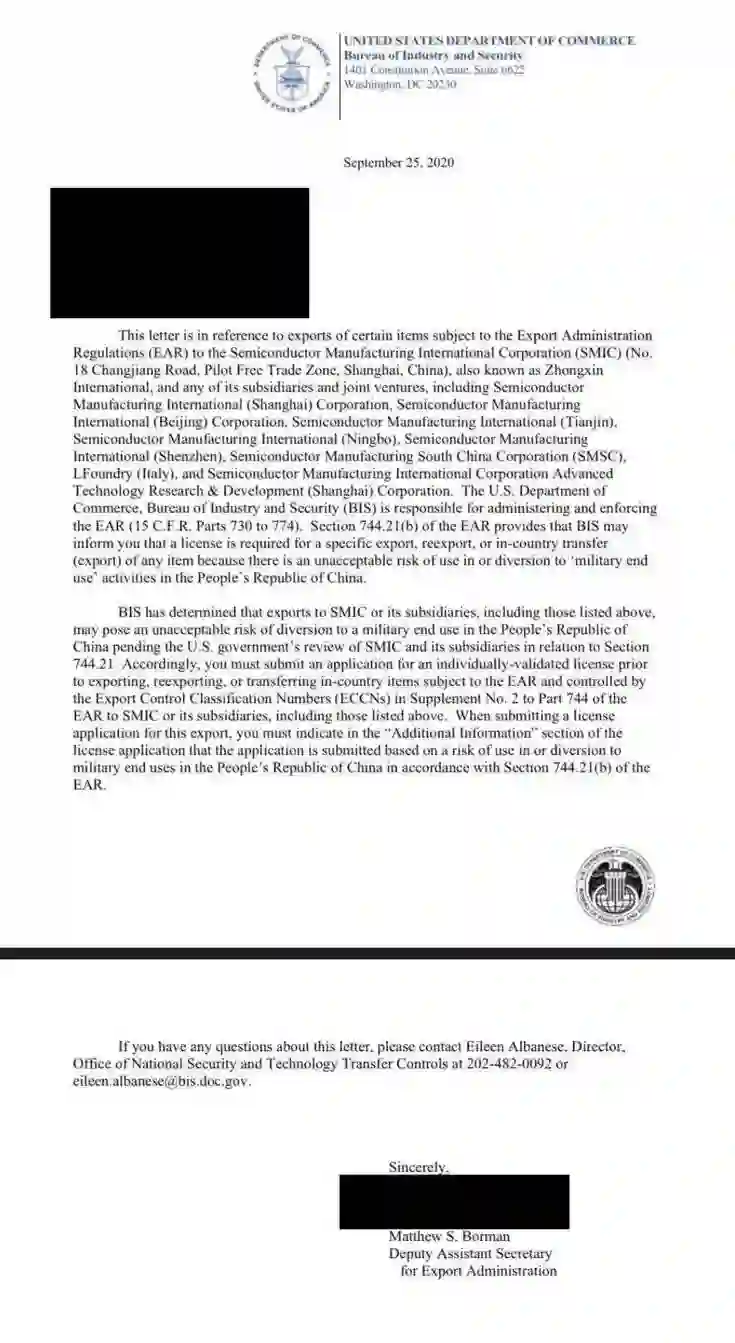 路透社等权威媒体也纷纷传出消息,援引一封美国商务部周五发出的信件,称遭到美国政府出口限制的包括中芯国际在上海、北京、天津、深圳、宁波等地乃至意大利的分公司和合资公司。任何受该出口限制令影响的供应商若想继续给中芯国际供货,就得向美国政府申请出口许可证。