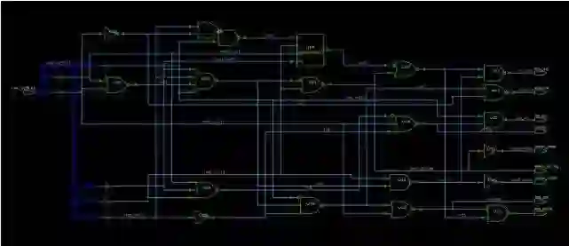 有了完整规画后,接下来便是画出平面的设计蓝图。在 IC 设计中,逻辑合成这个步骤便是将确定无误的 HDL code,放入电子设计自动化工具(EDA tool),让电脑将 HDL code 转换成逻辑电路,产生如下的电路图。之后,反覆的确定此逻辑闸设计图是否符合规格并修改,直到功能正确为止。