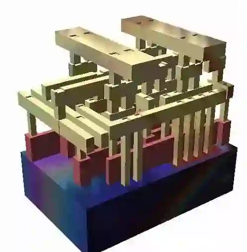 在开始前,我们要先认识 IC 芯片是什么。IC,全名积体电路(Integrated Circuit),由它的命名可知它是将设计好的电路,以堆叠的方式组合起来。藉由这个方法,我们可以减少连接电路时所需耗费的面积。下图为 IC 电路的 3D 图,从图中可以看出它的结构就像房子的樑和柱,一层一层堆叠,这也就是为何会将 IC 制造比拟成盖房子。
