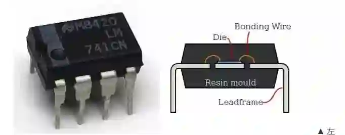 ▲ 左图的 IC 芯片为 OP741,是常见的电压放大器。右图为它的剖面图,这个封装是以金线将芯片接到金属接脚(Leadframe)。(Source :左图 Wikipedia、右图 Wikipedia)