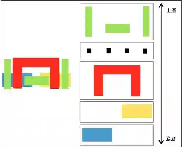 首先,在这里可以将红色的部分比拟成高楼中的一楼大厅。一楼大厅,是一栋房子的门户,出入都由这裡,在掌握交通下通常会有较多的机能性。因此,和其他楼层相比,在兴建时会比较复杂,需要较多的步骤。在 IC 电路中,这个大厅就是逻辑闸层,它是整颗 IC 中最重要的部分,藉由将多种逻辑闸组合在一起,完成功能齐全的 IC 芯片。