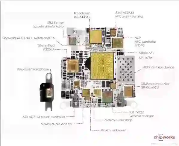 采用 SiP 技术的产品,最着名的非 Apple Watch 莫属。因为 Watch 的内部空间太小,它无法采用传统的技术,SoC 的设计成本又太高,SiP 成了首要之选。藉由 SiP 技术,不单可缩小体积,还可拉近各个 IC 间的距离,成为可行的折衷方案。下图便是 Apple Watch 芯片的结构图,可以看到相当多的 IC 包含在其中。