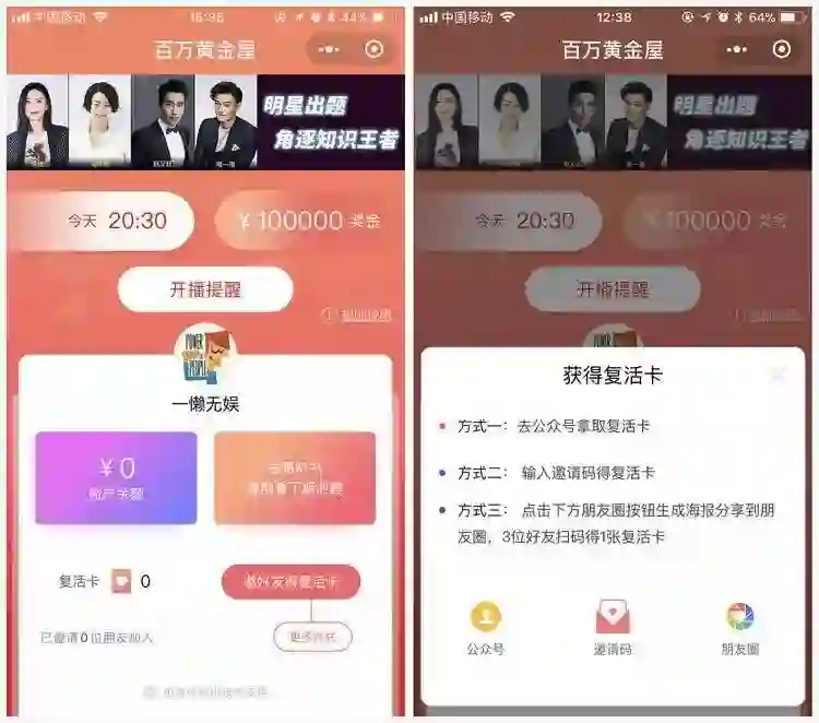 对于那些没有产品联动,「独立生长」的直播答题 App 来说,获取新用户的方法要少了很多,没有其他产品导流,只靠砸钱很难生存,所以依托微信的小程序就成了新的用户增长点。在百万黄金屋中,除了传统的邀请码外,用户还可以通过关注公众号、分享朋友圈获得复活卡,一边增加留存,一边拉新。