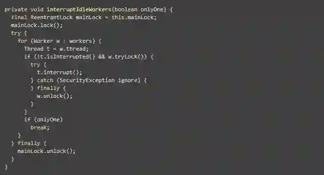 在shutdown()方法中,其首先检查当前线程是否有修改线程状态的权限,然后将当前线程池的状态修改为SHUTDOWN,接着调用interruptIdleWorkers()方法中断所有处于空闲状态的线程,最后则是调用tryTerminate()方法尝试将当前线程池的状态由SHUTDOWN修改为TERMINATED,这里interruptIdleWorkers()方法最终会调用其重载方法interruptIdleWorkers(boolean)方法,该方法代码如下: