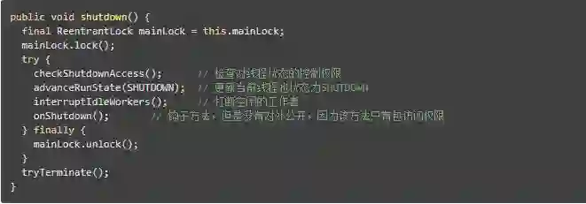 以上execute()方法的主要实现步骤,在ThreadPoolExecutor中另一个至关重要的方法则是shutdown()方法,以下是shutdown()方法的主要代码:
