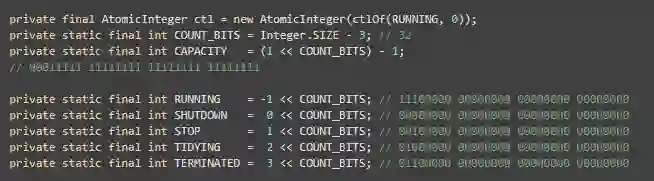 由于ThreadPoolExecutor需要管理多种状态,并且还要记录当前执行任务的线程的数量,如果使用多个变量,并发更新时管理将会非常复杂,这里ThreadPoolExecutor则主要使用一个AtomicInteger类型的变量ctl存储所有主要的信息。