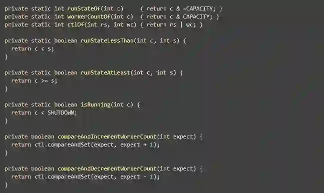 这几种状态对应的具体数值信息如上述代码所示,这里需要注意的一点是,在ThreadPoolExecutor中,这几种状态在数值上是从小到大依次增大的,并且状态流转也是依次往下的,这就为其判断状态信息提供了比较便利的方式,如当需要判断线程池状态是否处于SHUTDOWN状态时,只需要判断其代表状态位部分的值是否等于SHUTDOWN即可。在ctl中,除了最高三位用于表示状态外,其余位所代表的数值则指定了当前线程池中正在执行任务的线程数。如下是操作ctl属性的相关方法: