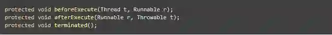 除上述用于执行任务的方法外,ThreadPoolExecutor还提供了如下几个hook(钩子)方法:
