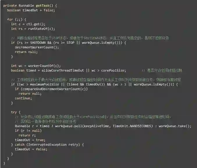 可以看到,在runWorker()方法中,其首先会执行工作者对象的初始化任务,当执行完毕后会通过一个无限循环不断在任务队列中获取任务执行。如下是getTask()方法的源码: