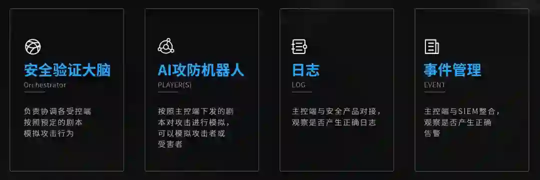 其中,安全验证大脑会指挥 Ai攻防机器人扮演攻击或者被攻击的角色,也会下发演练的剧本。