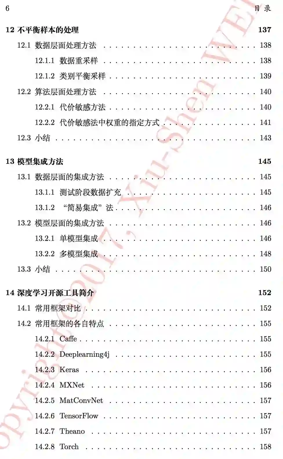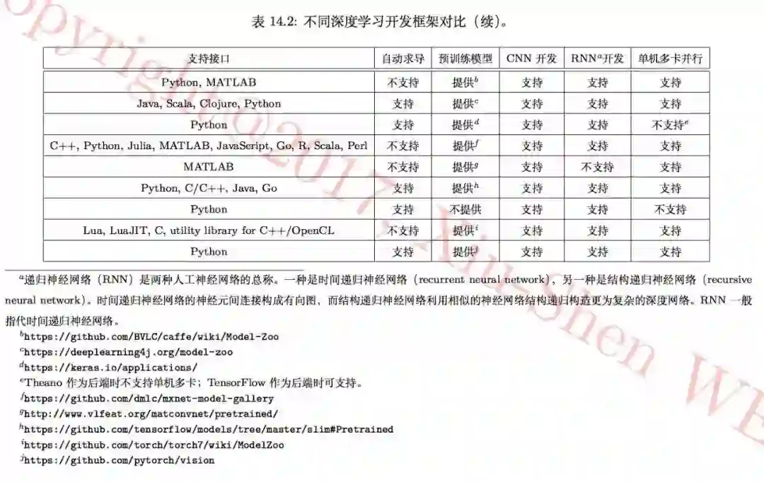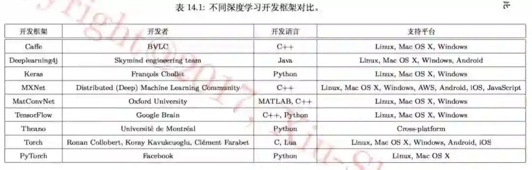 表 14.2 中从“开发语言”、“支持平台”、“支持接口”、是否支持“自动求导”、 是否提供“预训练模型”、是否支持“单机多卡并行”运算等 10 个方面,对包 含 Caffe、 MatConvNet、 TensorFlow、 Theano 和 Torch 在内的 9 个目前最常用的深度学习开源框架进行了对比。
