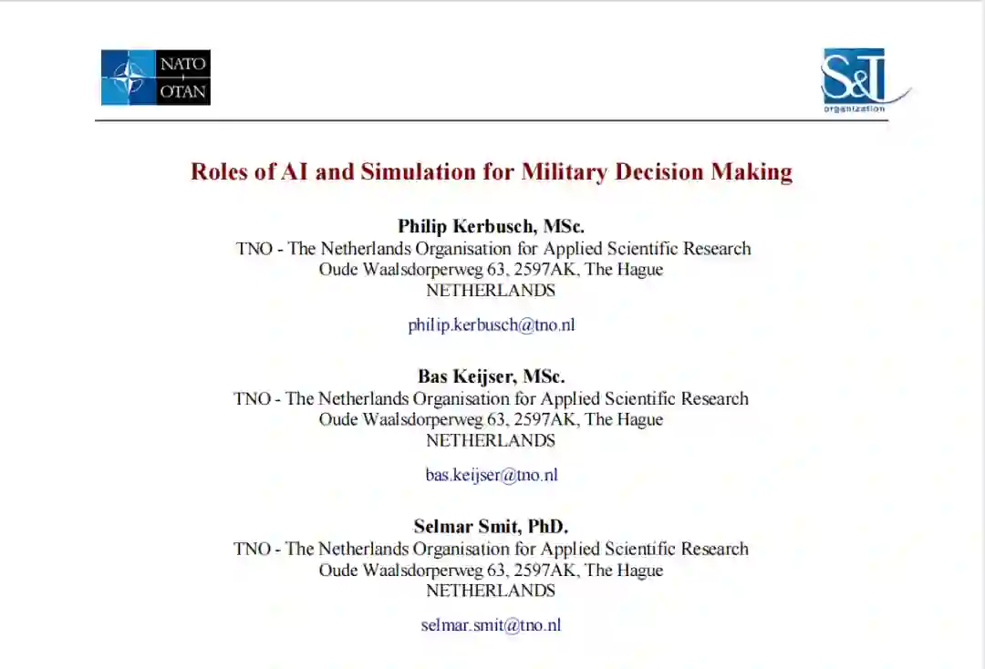 对于所有这些应用,人工智能技术可以在不同的情况下被使用,并且已经开始被使用,因此有不同的要求。在本文中,我们概述了人工智能技术和模拟在决策"系统"中的不同作用,目的是在我们的社区中促进对人工智能的综合看法,并为用于军事决策的各种人工智能研发奠定基础。
