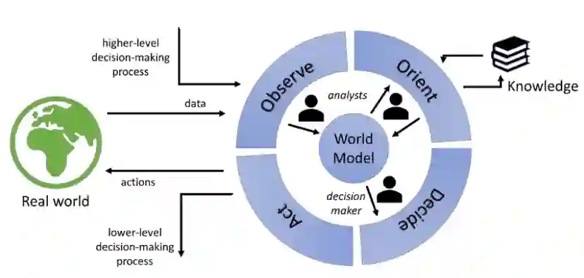 人工智能技术可以以各种方式改善这个决策系统。例如,人工智能技术被用来从(大)数据流中提取观察结果,自动建立(物理/人类/信息)地形模型,产生对未来事件和行动方案的预测,分析这些预测,向人类决策者解释结果,并建立人类决策者的用户模型。