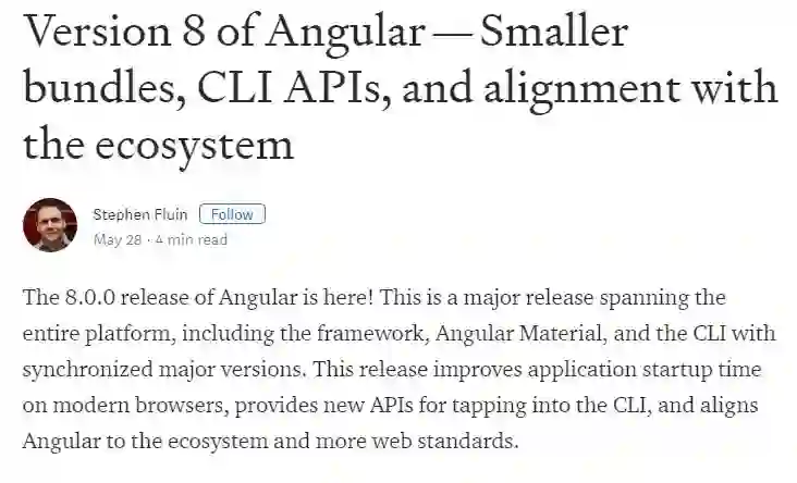 团队表示 Angular 8 显著减少了在现代浏览器中应用程序的启动时间、提供了用于定制 CLI 的新 API,并让 Angular 与生态系统以及更多的 Web 标准保持一致。