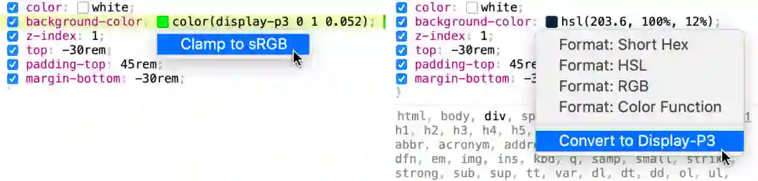 // Color Level 4.colour {--fn-notation: hsl(2rad 50% 50% / 80%);--neon-pink: color(display-p3 1 0 1);--gray: lch(50% 0 0);--fallback: color(lab 25 25 25, display-p3 1 0 1,}// Color Level 5.colour {--pink: color-mix(red, white);--halfpink: color(var(--pink) / 50%);--halfred: rgb(from--darkred: hsl(from red h s calc(l * .25));}