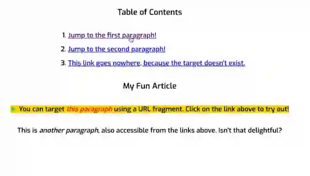 <!-- HTML --><h3>Table of Contents</h3><ol><li><a href="#p1">Jump to the first paragraph!</a></li><li><a href="#p2">Jump to the second paragraph!</a></li><li><a href="#nowhere">This link goes nowhere, because the target doesn't exist.</a></li></ol><h3>My Fun Article</h3><p id="p1">You can target <i>this paragraph</i> using a URL fragment. Click on the link above to try out!</p><p id="p2">This is <i>another paragraph</i>, also accessible from the links above. Isn't that delightful?</p>/* CSS */p:target {background-color: gold;}/* 在目标元素中增加一个伪元素*/p:target::before {font: 70% sans-serif;content: "►";color: limegreen;margin-right: .25em;}/*在目标元素中使用italic样式*/p:target i {color: red;}