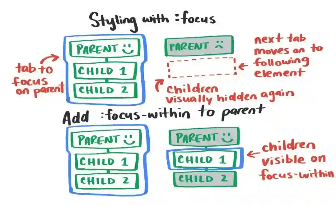 /* 链接得到焦点时的样式 */a:focus {}/** 1. 如果链接有焦点,但是浏览器通常不会显示默认的焦点样式,会覆盖上面的焦点样式* 2. 不是按键盘`tab`键让链接得到的焦点,比如说鼠标点击链接*/a:focus:not(:focus-visible) {}/* 按键盘tab键让链接得到焦点的样式 */a:focus-visible {}
