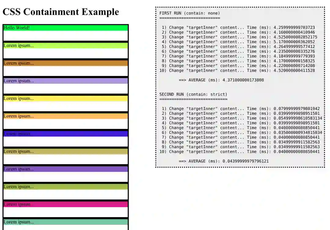const NUM_ITEMS = 10000;const NUM_REPETITIONS = 10;function log(text) {let log = document.getElementById("log");log.textContent += text;}function changeTargetContent() {log("Change \"targetInner\" content...");// Force layout.document.body.offsetLeft;let start = window.performance.now();let targetInner = document.getElementById("targetInner");targetInner.textContent = targetInner.textContent == "Hello World!" ? "BYE" : "Hello World!";// Force layout.document.body.offsetLeft;let end = window.performance.now();let time = window.performance.now() - start; log(" Time (ms): " + time + "\n");return time;}function setup() {for (let i = 0; i < NUM_ITEMS; i++) {let item = document.createElement("div");item.classList.add("item");let inner = document.createElement("div");inner.style.backgroundColor = "#" + Math.random().toString(16).slice(-6);inner.textContent = "Lorem ipsum...";item.appendChild(inner);wrapper.appendChild(item);}}