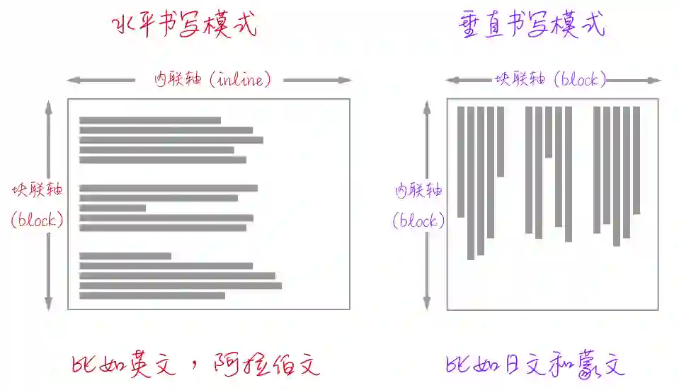 块轴:主要定义网站文档(元素块)流,CSS的书写模式writing-mode会影响块轴的方向。