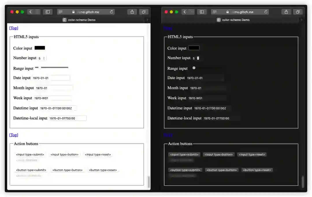 Improved dark mode default styling with the color-scheme CSS property and the corresponding meta tag
