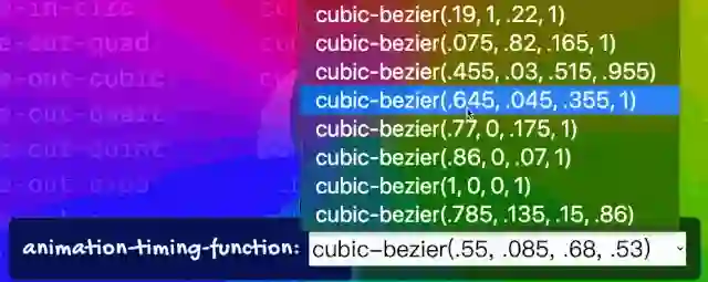 :root {--ease-in-quad: cubic-bezier(0.55, 0.085, 0.68, 0.53);--ease-in-cubic: cubic-bezier(0.55, 0.055, 0.675, 0.19);--ease-in-quart: cubic-bezier(0.895, 0.03, 0.685, 0.22);--ease-in-quint: cubic-bezier(0.755, 0.05, 0.855, 0.06);--ease-in-expo: cubic-bezier(0.95, 0.05, 0.795, 0.035);--ease-in-circ: cubic-bezier(0.6, 0.04, 0.98, 0.335);--ease-out-quad: cubic-bezier(0.25, 0.46, 0.45, 0.94);--ease-out-cubic: cubic-bezier(0.215, 0.61, 0.355, 1);--ease-out-quart: cubic-bezier(0.165, 0.84, 0.44, 1);--ease-out-quint: cubic-bezier(0.23, 1, 0.32, 1);--ease-out-expo: cubic-bezier(0.19, 1, 0.22, 1);--ease-out-circ: cubic-bezier(0.075, 0.82, 0.165, 1);--ease-in-out-quad: cubic-bezier(0.455, 0.03, 0.515, 0.955);--ease-in-out-cubic: cubic-bezier(0.645, 0.045, 0.355, 1);--ease-in-out-quart: cubic-bezier(0.77, 0, 0.175, 1);--ease-in-out-quint: cubic-bezier(0.86, 0, 0.07, 1);--ease-in-out-expo: cubic-bezier(1, 0, 0, 1);--ease-in-out-circ: cubic-bezier(0.785, 0.135, 0.15, 0.86);--easing: var(--ease-in-quad);}.animation__target {animation: ani 5s var(--easing) alternate infinite;}// JavaScriptconst handlerElement = document.getElementById("easing");handlerElement.addEventListener("change", function (e) {document.documentElement.style.setProperty("--easing", e.target.value);});