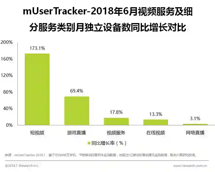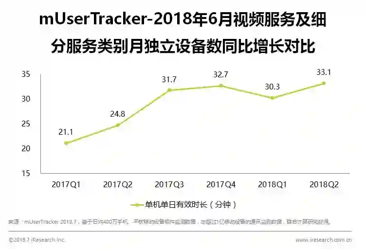 当前短视频行业可以说一半是海水,一半是火焰。2016年以来,短视频行业持续升温,不论平台、资本还是用户,各方热情都从未减退。艾瑞移动用户行为监测产品mUserTracker数据显示,2018年6月短视频行业月独立设备数的同比增长率高达173.1%,在所有视频服务的细分类别中遥遥领先,而同期视频服务整体的月独立设备数同比增长率仅为17.8%。从触媒习惯来看,用户投入在短视频上的时间也保持不断增长的态势,单机单日有效使用时长已经从2017年第一季度的21.1分钟增长到2018年第二季度的33.1分钟。短视频行业在快速发展的同时伴随着巨大的商业价值和想象空间,也吸引着越来越多的玩家从观望到入局,抢夺行业快速发展期的红利。