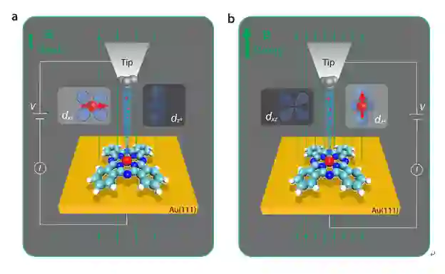 图1. 磁场对金单晶表面单个酞菁铁分子的电子传输路径调控示意图。