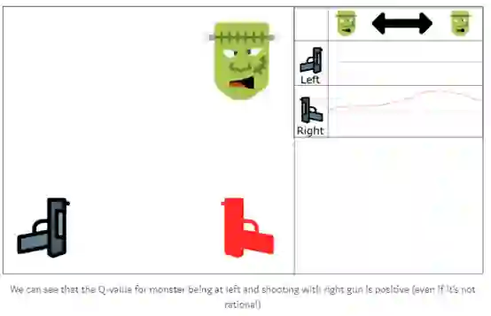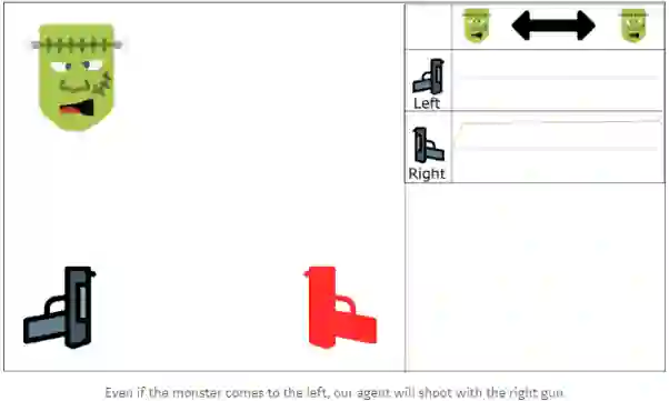 如果agent无法看到足够多的左边的例子(30%概率),那么agent将认为朝右开枪始终是对的,而不关心其他的因素。