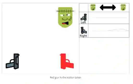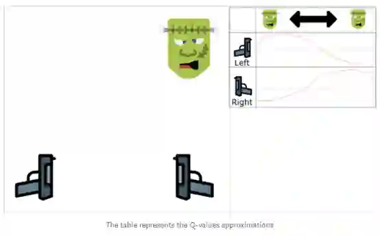 可以通过例子来简单理解一下,首先,我们使用第一个射手,对面是一个怪兽,可以从左运动到右。我们有两把枪于两个可选动作,向左开枪与向右开枪。