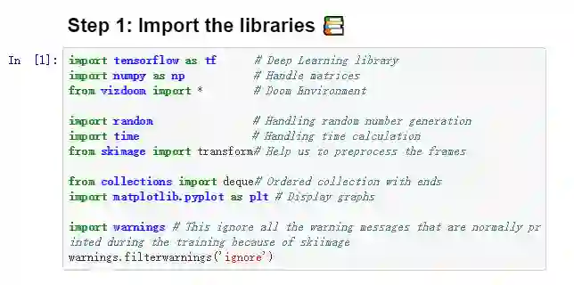 现在我们知道强化学习是如何工作的了,我们将一步步实现我们自己的深度Q学习模型。每一步的代码都可以在下文中的Jupyter上面查看。