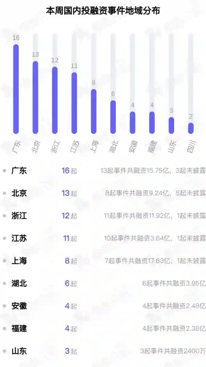 从本周披露获投企业的地域分布来看,主要集中在广东、北京、浙江。其中广东发生16起,北京发生13起,浙江发生12起。